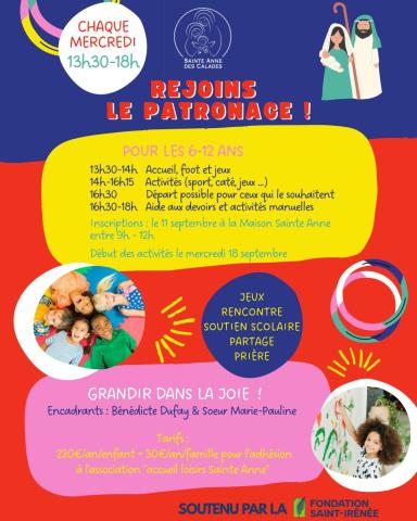 Pour les 6 à 12 ans ! Les activités ont démarré le 10 septembre ! Toute une équipe est à pied d'œuvre pour accueillir les enfants et leur proposer de vivre des après-midis riches, festives, sportives et créatives sous le regard du Seigneur. Pour cette rentrée 2025- 2026, le patronage sera ouvert chaque mercredi après-midi durant les périodes scolaires.